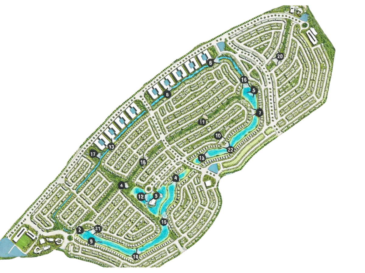 • The plan includes man-made lagoons, landscaped promenades, private beaches, and water features weaving through the clusters.